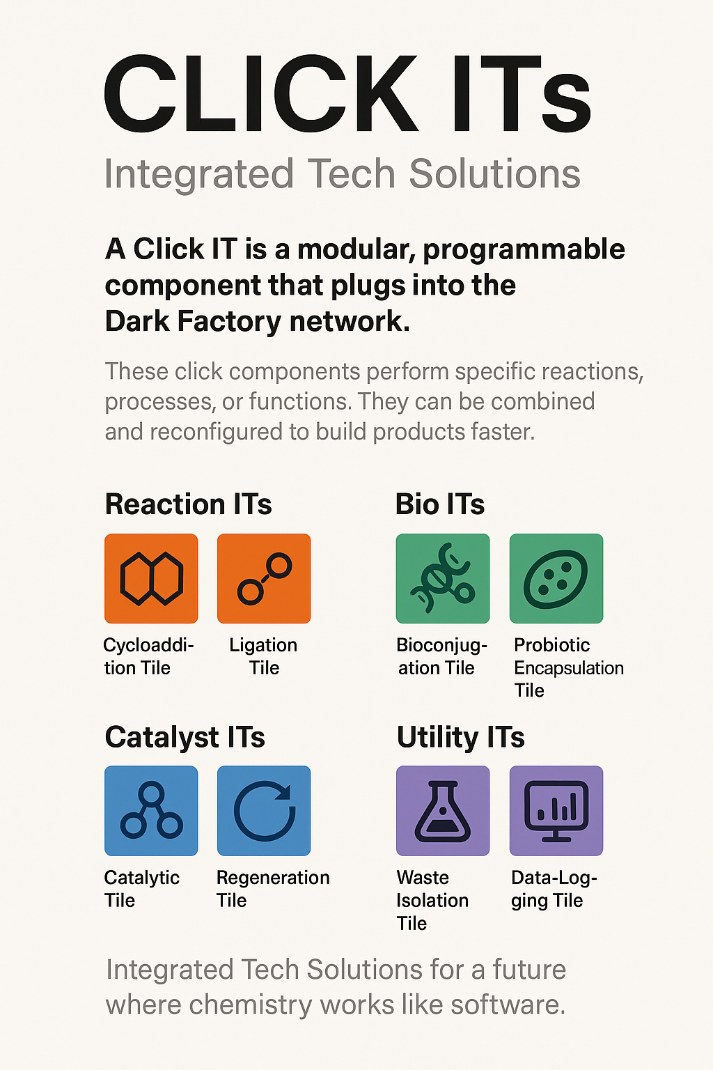 At the heart of the Click Chemistry Dark Factory is a new way of thinking about making things: a programmable, modular, and largely self-directing ecosystem where chemistry, biology, and computation interlock like puzzle pieces. Instead of building one drug, one material, or one process at a time, the factory becomes a living architecture of tiles—each tile representing a reaction, a tool, or a biological function.