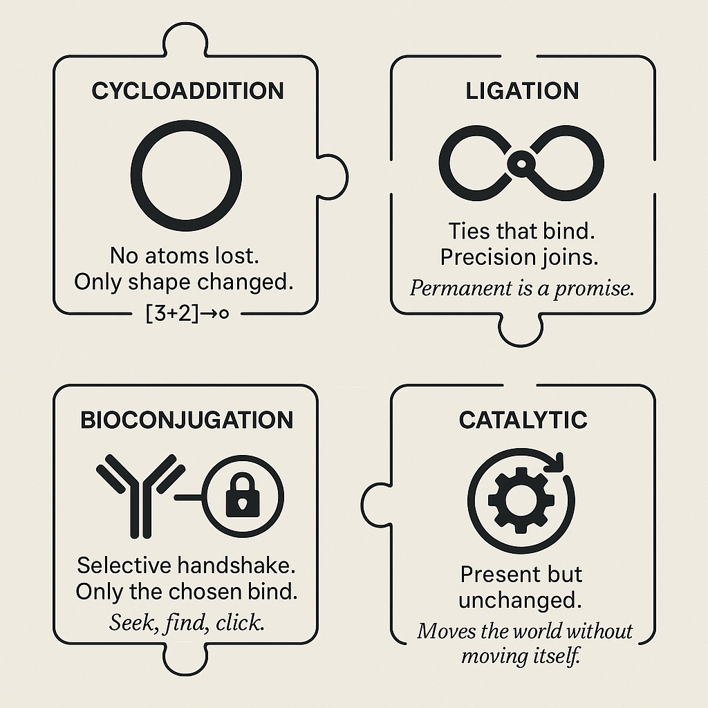 At the heart of the Click Chemistry Dark Factory is a new way of thinking about making things: a programmable, modular, and largely self-directing ecosystem where chemistry, biology, and computation interlock like puzzle pieces. Instead of building one drug, one material, or one process at a time, the factory becomes a living architecture of tiles—each tile representing a reaction, a tool, or a biological function.